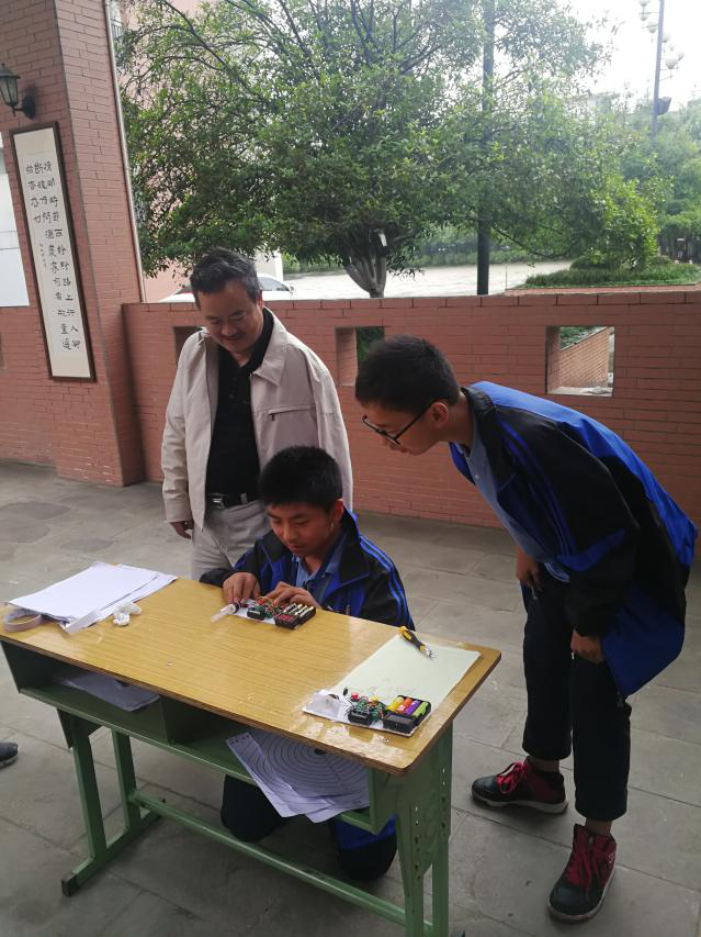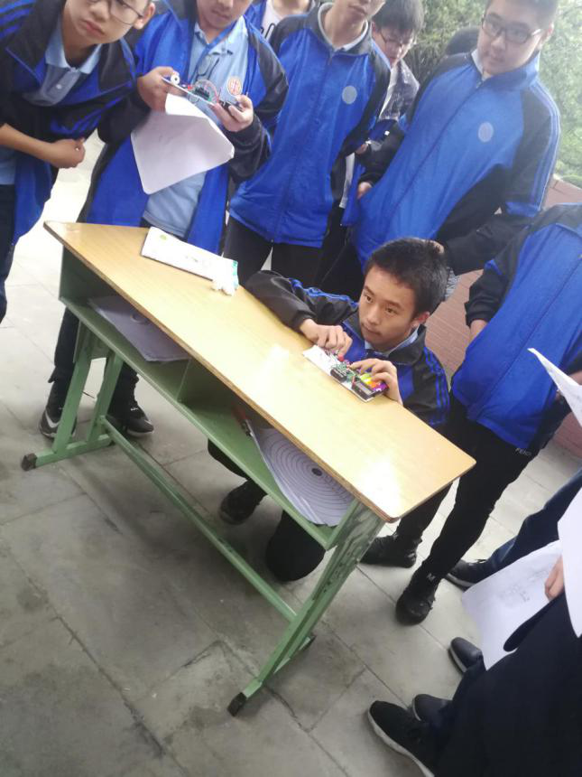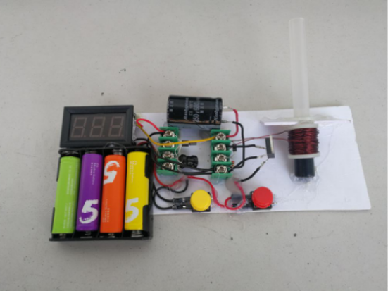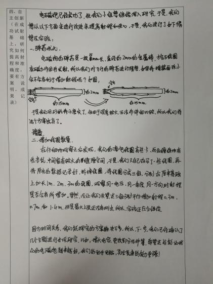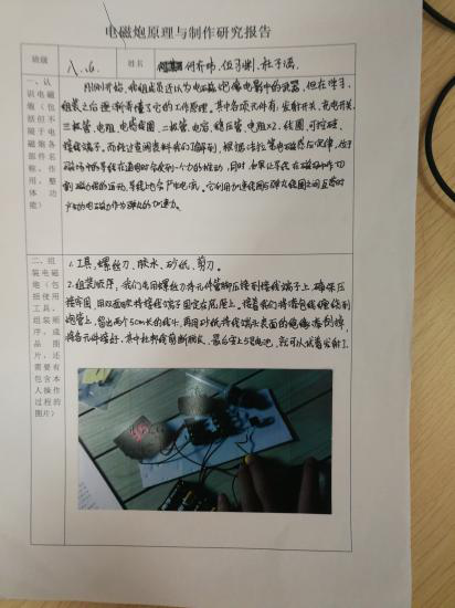 它的原理是位于磁场中的导线在通电时会受到一个力的推动,从而将“炮弹”发射出去。 本届科技节创意比赛之电磁炮比赛,由科技总辅导员王伟负责总体设计,并负责培训各班选拨的两位同学进行培训,学生自行组装、试射。本届比赛跟以往相比,还新增了一项内容,即要求学生撰写工程日志,在培养学生动手能力的同时,还培养学生的写作能力、反思习惯。