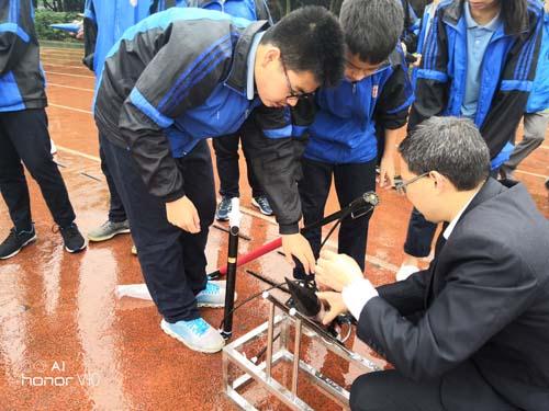 下午,物理老师们早早地来到运动场,放置好水火箭发射架,准备好打气筒,用警戒线拉出了安全区域,做好了各项相关准备工作。参赛同学们带着他们精心制作的五十多只精品 “水火箭”,迫不及待地聚集到了运动场。