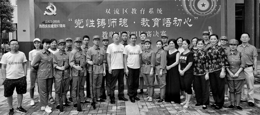 为庆祝中国共产党成立97周年,中共成都市双流区教育局党组举办了“党性铸师魂•教育悟初心”教职工歌唱比赛。我校积极影响上级领导部门号召,由学校工会牵头,以音乐组教师为核心,中小学联合组成了一支33人的参赛队伍,并在夏栋梁、吴玲等音乐教师的精心策划下,编排了《在太行山上》的参赛曲目。