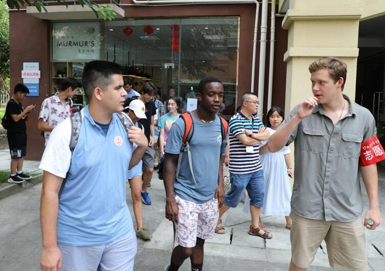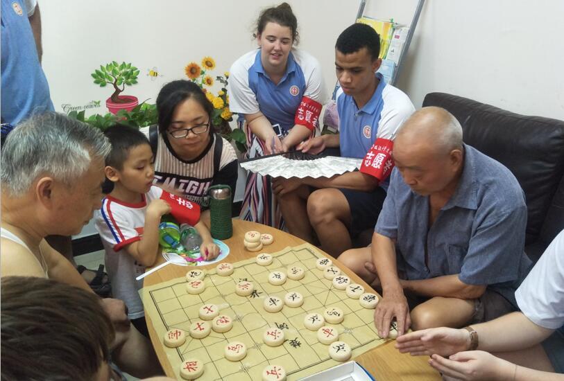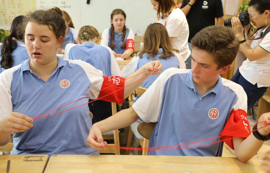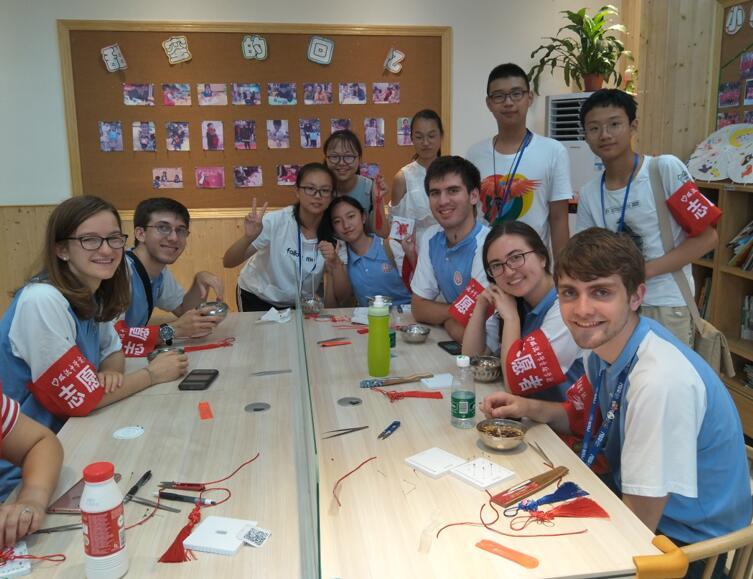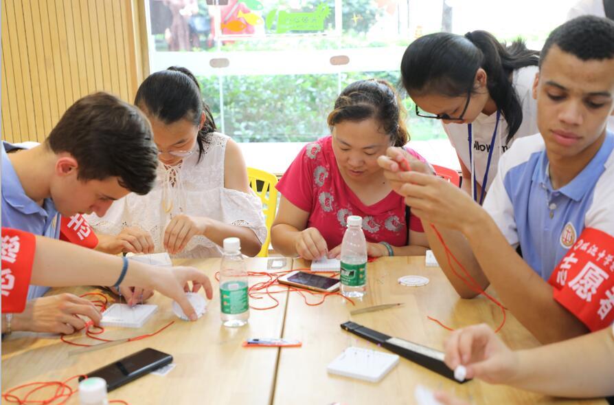 7月25日下午,29名美国学生来到双流区双桂社区交流学习,开展其职业体验活动课程。 首先,该社区的社工们带领着美国学生参观了murmur's手工作坊、志愿者服务中心、图书(科普)阅览室、430社区课堂、亲子乐园、姐妹工坊、夕阳公社。让他们大致了解中国社工的工作情况,期间美国学生在夕阳公社里,与老人一起交流,一起“斗地主”,陪老爷爷下棋,乐不思蜀。参观完毕,美国学生回到430课堂,体验手工课堂——制作中国结,由murmur's手工作坊的邓潺老师教学,传播中国传统文化,体验非物质文化遗产的制作。尽管中国结的编制对于我们中国学生来说都很难,但是这些美国小哥哥小姐姐们却意兴盎然。即将进入麻省理工大学的Noah来来回回做了六次,终于做出了令自己满意的作品。体验了中国的传统文化后,怎能错过传统美食呢?体贴的社工们,在活动结束后,还为美国学生们提供了清凉美味的消暑甜品--冰粉。