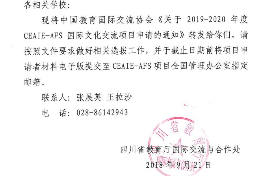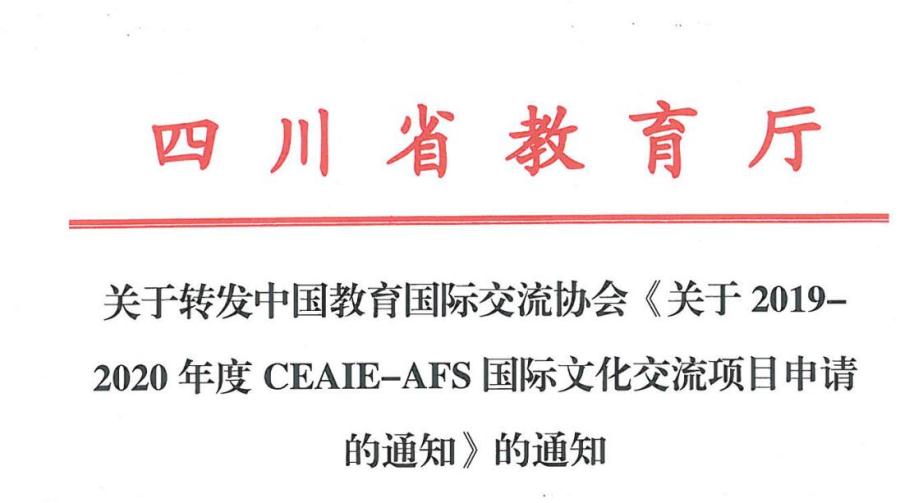 四川省教育厅转发中国教育国际交流协会关于2019-2020年度AFS项目申请的通知
