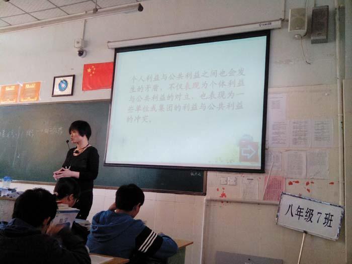本次为大家献课的是卢金兰老师,她选取的课题是八年级下册第二单元第五课《公私之间》。卢老师通过复习上节课《关涉全人类的公共利益》的相关内容过度到本节课的教学当中来,卢老师选取了和日本311地震相关的视频导入新课,同学们非常投入的观看视频,卢老师还一边解读,学生非常感兴趣,这是对课模中在“精巧导入”环节的准确把握。紧接着卢老师通过提问的方式把学生从视频带来的震撼中引向对“公司关系”的深入思考中去,地震和海啸给国家和民众带来哪些影响?公共利益是如何产生的呢?……一系列问题的追问是对教材知识点的准确把控。接下来一连串和地震相关的照片视频接踵而至,尤其是50名死士不顾自身安危坚守核泄漏场所第一线的场景让很多学生感动,在启发中一次又一次和教材相关知识的的无缝衔接使得学生在享受中获取知识,在轻松愉悦的环境中感悟道理,这应该就是学生最向往的“快乐学习,健康成长”的教学模式吧。