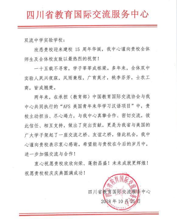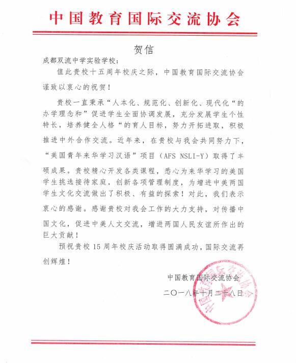 两封来自中国教育国际交流协会和四川省教育国际交流服务中心的贺信