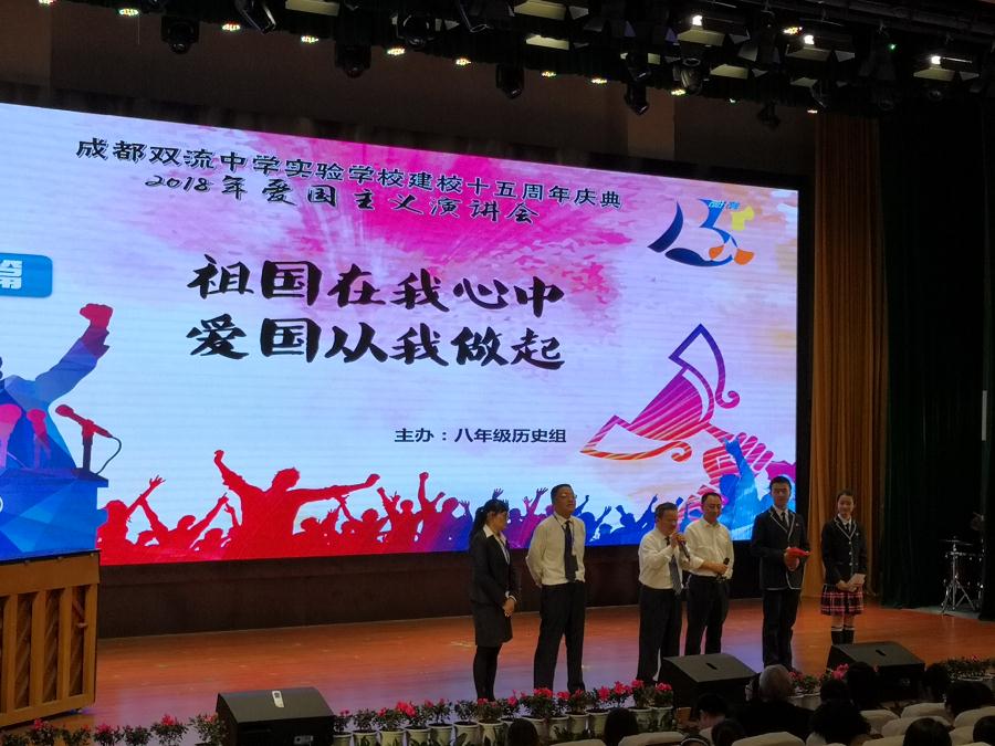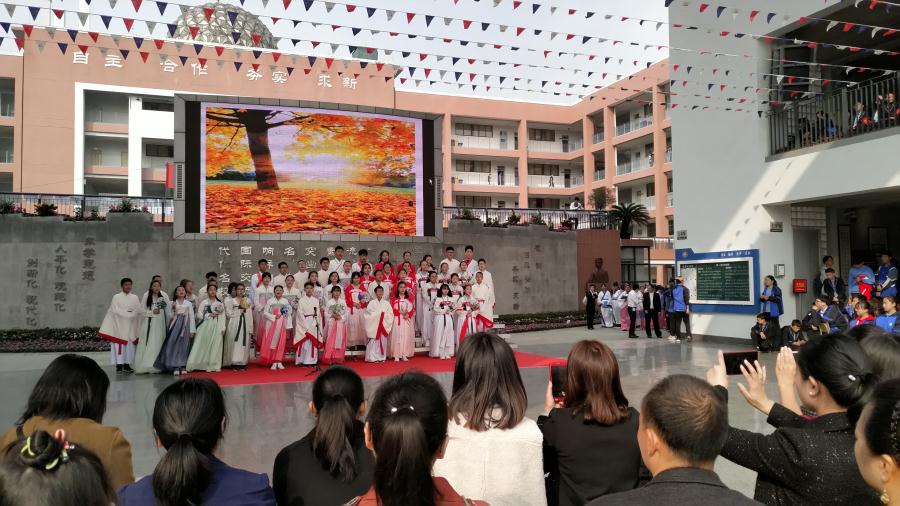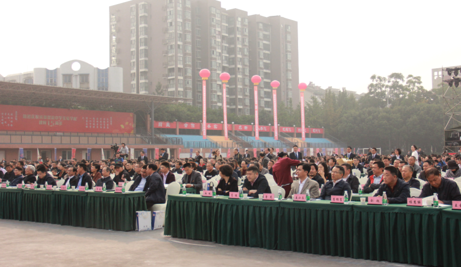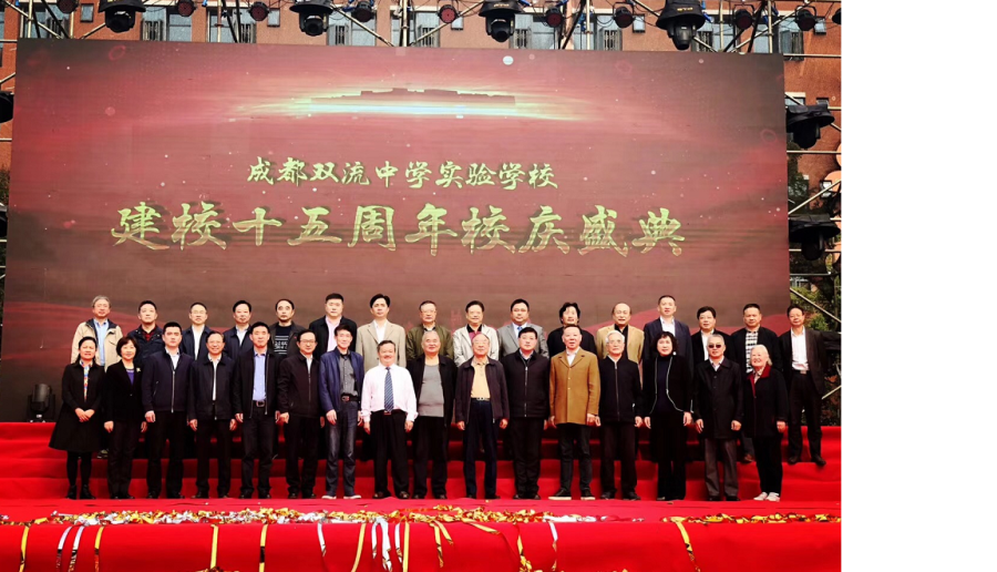 9:30,校庆典礼正式开始,原四川省教育委员会主任王可植,四川省美协主席、原四川省文联党组书记、省文化厅副厅长钱来忠,原成都市人大副主任、成都市人民政府资政、成都市教育局局长杨伟,原四川省人民政府督学刘东,四川省教育厅副厅长崔昌宏,中共成都市双流区委副书记、双流区人民政府区长鲜荣生,成都市教育局副局长左华荣,成都市双流区教育局党组书记、局长李光纯,四川省民办教育协会会长、成都东软学院党委书记、院长张应辉,成都市民办教育协会会长、四川西南航空职业学院董事长魏全斌等省市区领导,教育部基础二司研究员柳夕浪,中国高等教育学会综合实践活动学科委员会理事长杨培禾,四川省教育科学研究院院长刘涛,四川省合唱协会理事长、四川省音乐家学院正院级调研员、四川省学科技术带头人李西林,四川省教育厅首席专家、成都大学教授周小山,成都市教育科学研究院院长罗清红等省市区领导和国家省市区专家出席典礼活动,全国综合实践活动学科委员会、四川省民办教育协会、成都市民办教育协会、成都石室中学、成都七中、成都树德中学、康定中学等十余家单位发来贺信,热烈祝贺学校十五华诞,并对学校全体师生员工及广大校友致以了诚挚的问候。
