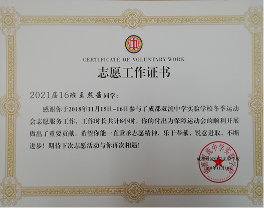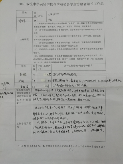 此次德育处以班级为单位将志愿者分为20个小组,并首次为每位组长分发了工作记录表,用于记录本组志愿者的工作表现、反思工作得失、总结工作经验和对志愿者工作提出建议。志愿者们在总结反思中加深了对志愿者工作的理解,增强了责任感和使命感;认识到了自身存在的不足,找到了提升自己能力和完善自我的方向。运动会结束后,德育处为每位志愿者颁发了志愿工作证书,并对表现优秀的同学进行了表彰,让他们体验到了参加志愿者工作的成就感和荣誉感。