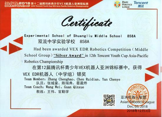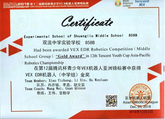 我校VEX机器人获得十二届腾讯杯青少年VEX机器人亚洲锦标赛国际金奖