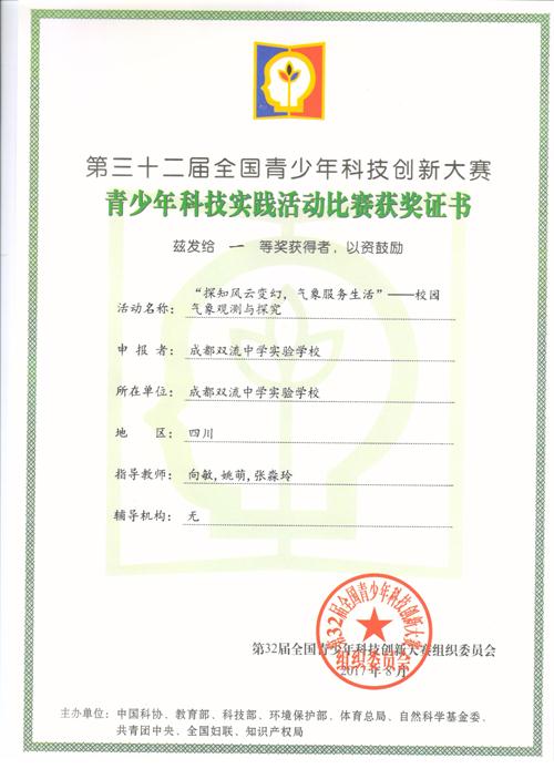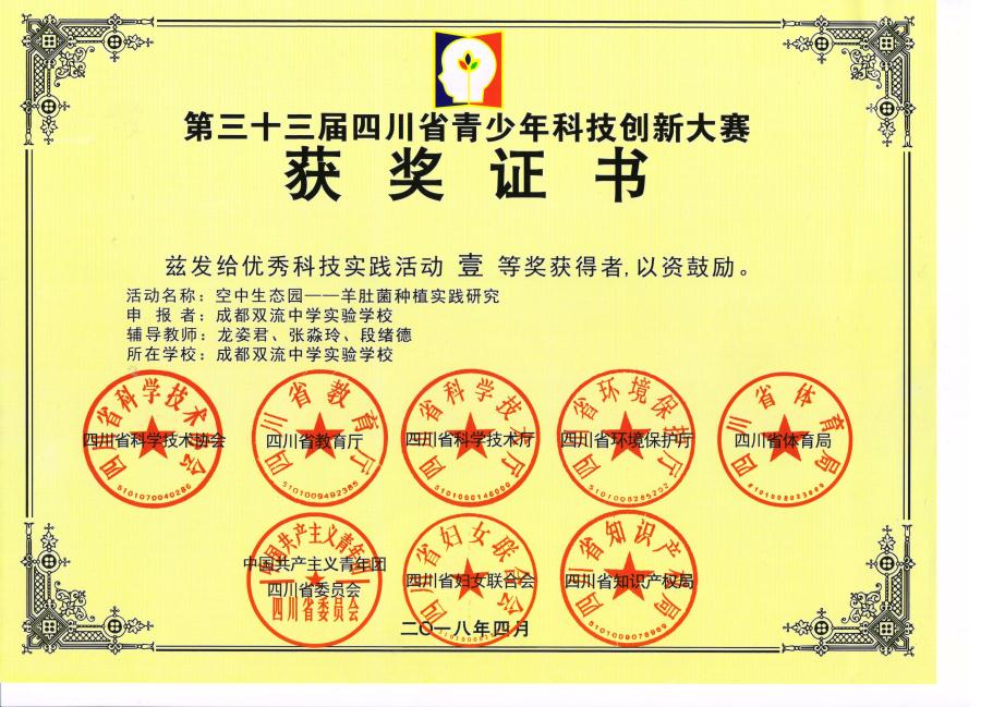随着综合实践活动及科技教育工作的深入开展,我校参加各级科创大赛屡获大奖。如《探知风云变幻,气象服务生活--校园气象观测与探究》获2017年全国第32届科创大赛一等奖的同时还被评为“全国十佳科技实践活动”。2018年,科技实践活动《空中生态园--羊肚菌的种植实践探究》获四川省科创大赛一等奖和全国科创大赛一等奖,这也是四川推荐的八项科技实践活动成果参加全国科创大赛中唯一的全国一等奖,为四川科技教育争光添彩。参加2018年四川省首届环境科普大“讲”赛,提交的3项作品分别获得大赛第一、二、四名,占全部六个一等奖的一半。