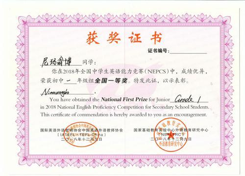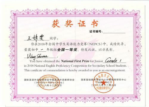 2018年度全国中学生英语能力竞赛成绩揭晓,我校2021届七年级104人取得优异成绩,4人荣获全国一等奖,8人荣获全国二等奖,15人荣获全国三等奖,17人荣获省一等奖,26人荣获省二等奖,34人荣获省三等奖。