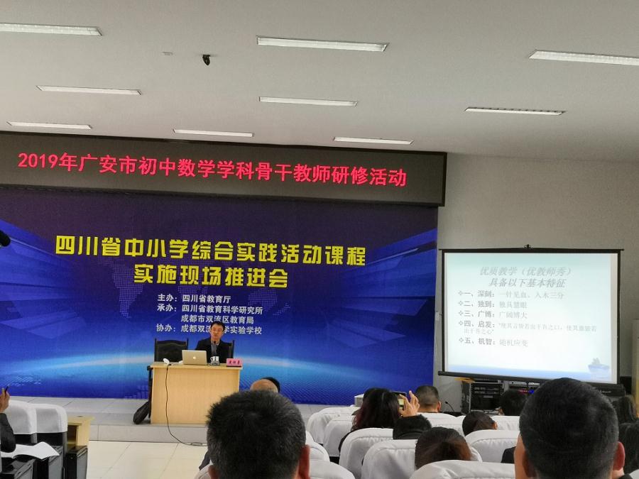 2019年4月3日,由四川省教科院举办的“2019年广安市初中数学学科骨干教师研修活动”在我校学术厅举行,活动邀请了成都市教科院院长助理、教师发展研究所所长黄祥勇作专题报告——《关注课堂教学,提高自身素质》基于教师改进课堂教学的视域。