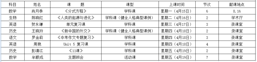 星空在线登录官网2018-2019学年度下期“人人献课”——第九周安排表(2019.4.15-2019.4.19)