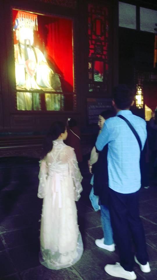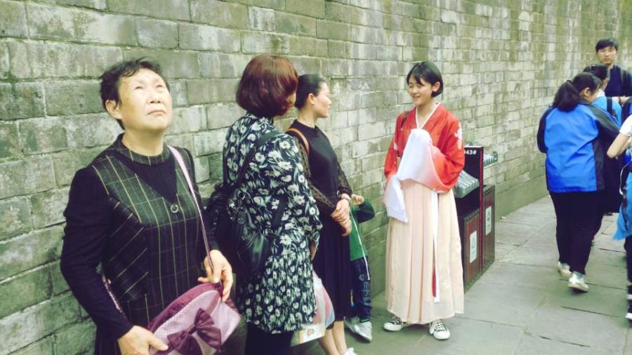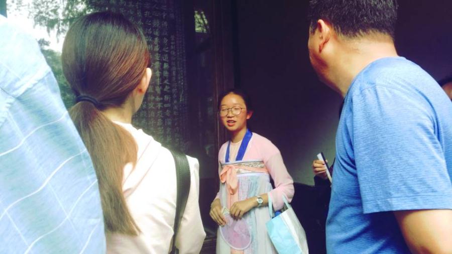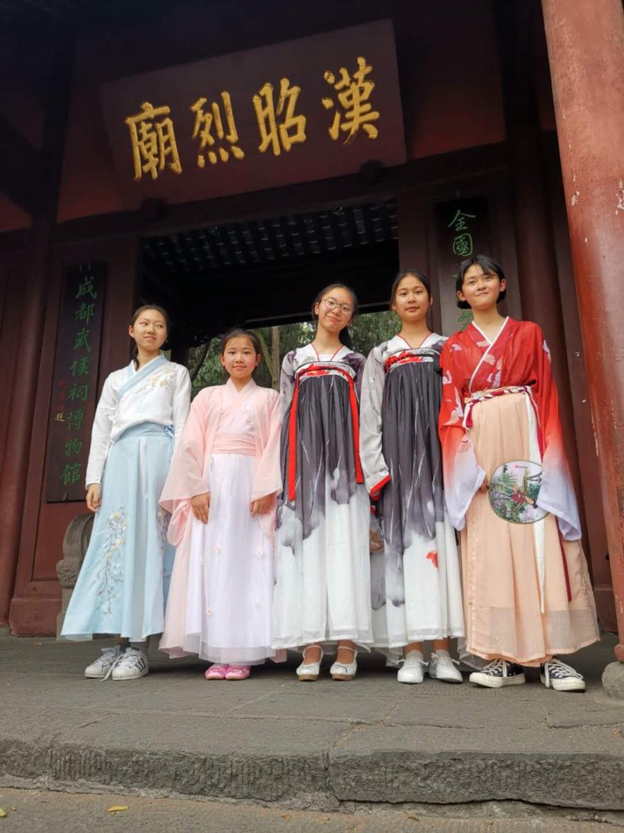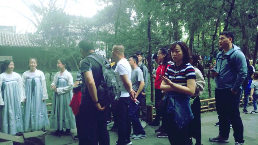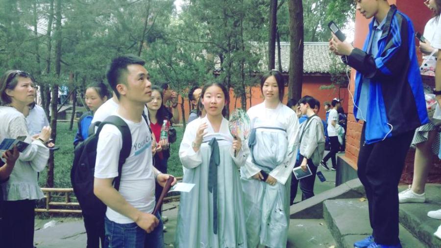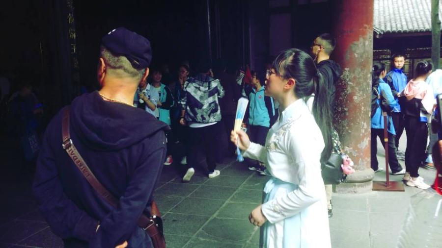 从“唐碑”到“刘备庙”,从“武将廊”到“惠陵”,身着汉服的新双中小导游,成了“丞相祠堂”前最靓丽的风景。从最初的战战兢兢到后来的主动出击;从一次次被拒绝到后来被游客团团包围,学生感受到了为别人服务带来的快乐,“唐碑组”的小导游从进入武侯祠一直讲解到活动结束。