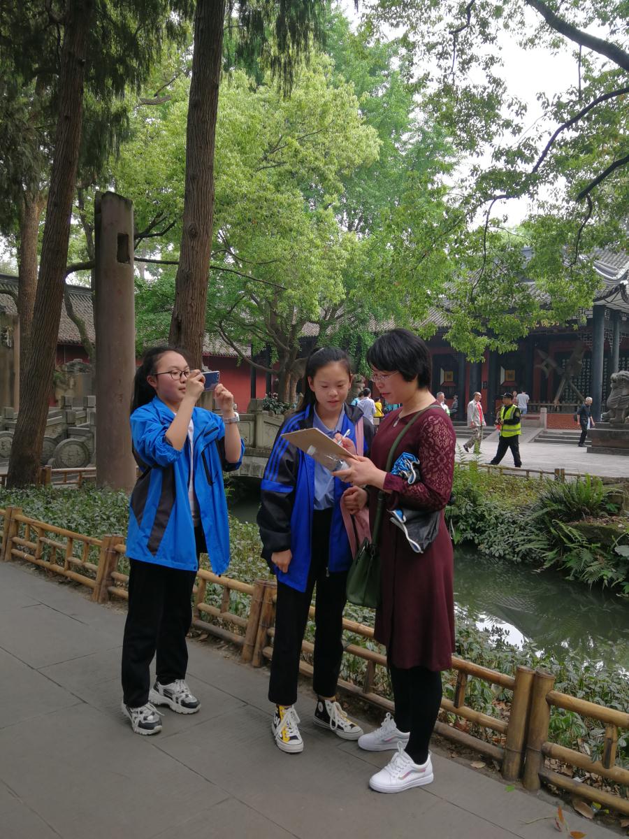 成都作为蜀国都城,三国历史文化厚重,七年级师生结合语文、历史和政治学科的内容特点开展了“走进武侯祠”外出综合实践活动。武侯祠的课题研究兼具文学和历史韵味,比如楹联的知识研究和典故等、诗歌和散文的创作、三国名人及武侯祠历史文化探究、博物馆文物保护、武侯祠旅游价值等。本次实地考察前师生均通过在校辅导课的时间做了充分的准备,拟定好小组研究课题,设计考察任务等。实地考察中同学们带着自己关注的问题,以小组为单位进行参观、调查、采访和体验等。学生积极参与,又乐在其中。