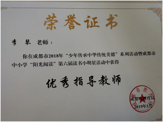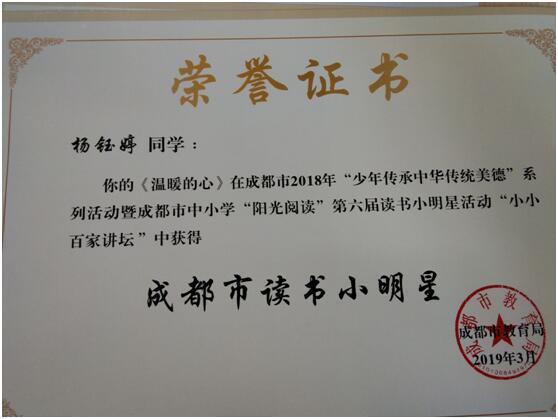 在我校人本化、规范化、创新化、现代化的办学理念下,学校教师践行“自主、合作、务实、求新”的校训,推进课程改革的素质教育,学生的德、智、体、美、劳全面发展。我校2020届5班学生杨钰婷的朗读作品《温暖的心》,在我校语文教师李琴老师的指导和打磨下,形成以“温暖”为话题,展现了当代初中生的精神面貌的朗诵视频,该作品在几千份作品中脱颖而出。并在成都市2018年“少年传承中华传统美德”系列活动暨成都市中小学“阳光阅读”第六届读书小明星活动“小小百家讲坛”中获得成都市读书小明星。李琴老师在成都市“阳光阅读”活动中获得“优秀指导教师”。(语文组)