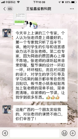 张淼玲老师为了不影响学校的正常教学工作,又能顺利完成示范课展示,克服了重重困难。4月18日下午恰逢我校开展七年级外出综合实践活动,由于是指导老师,张老师是在带领学生完成外出综合实践活动后,乘坐飞机到南宁,再乘坐3个多小时的汽车赶到百色已是凌晨1点多。仅仅5个多小时的休息,于早上9点30分正式上课,熟悉学生和调试教学课件仅有10分钟。在时间如此紧张的情况下,张淼玲老师从容、淡定,课前积极调整自己的状态,课中设计合理的问题对学生思维的引导,课后得到了与会领导和老师的高度评价。听课老师们评价说:张老师语言干练精准,鼓励性语言自然、合理;老师引导得也很到位,课堂掌控调节的好、学生学习积极性很好;教学手段科学合理,重难点突出;还有老师说这节课听下来,整节课给人感觉蛮舒服的。广西教科所生物教研员这样评价张老师的课:听起来非常舒服,整节课的设计环环相扣;而且对问题的设计,对学生的学习引导及学习成果的展示都非常自然而且贴切;板书是小纸条粘贴再加上张老师的简单手绘,简单而且清晰,非常棒的一节课。当然,还有广西的生物教研员客气的说,谢谢我们的献课,这是我们对广西教育的扶贫。上完课的学生也非常喜欢张老师,在和班主任沟通时,班主任也说:感谢张老师为孩子们上了一堂精彩的课,下课后班上还有很多孩子想来找张老师。