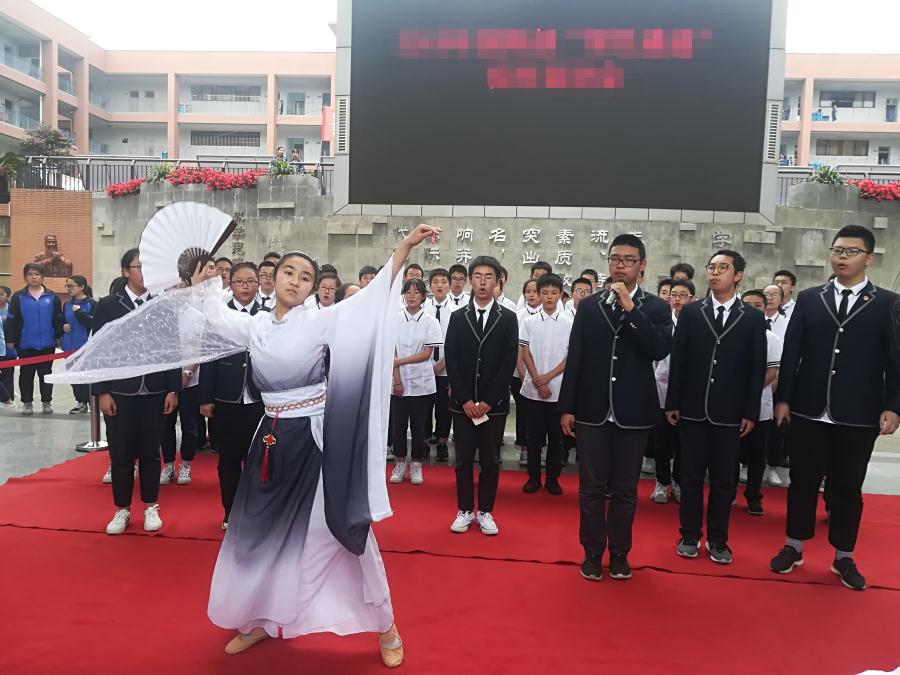 紧接着,付丽莎老师带领的八年级七班的孩子们面带微笑、意气风发地走上了舞台,其中两位同学手执一幅《将进酒》书法作品站在最前方,这幅书法作品挥洒自如,想必写出这幅书法的同学也定带有几分李白的潇洒吧。七班的男生一开口独诵,便如那从天上而来的黄河水,势极雄浑。适时,一位身着汉服的女生翩然起舞,那曼妙的身姿、优美的舞姿,再一次掀起本次展演活动的高潮。