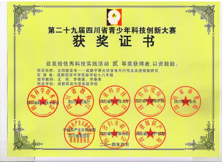 我校学生小组研究性学习课题、优秀科技实践活动《太阳能发电——成都平原光伏发电可行性及改进措施研究》荣获省二等奖。