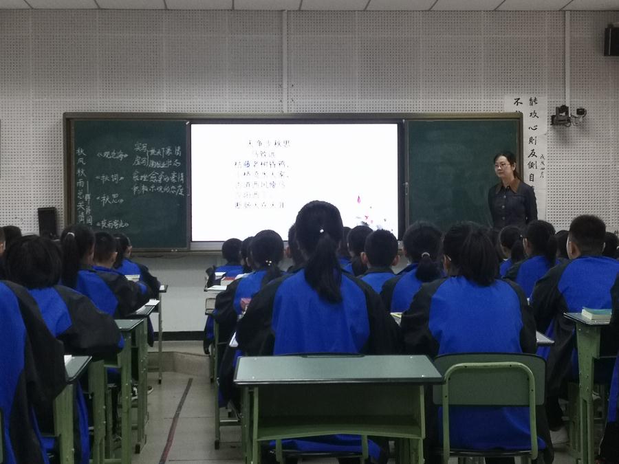 杨老师独具创新地将《观沧海》《秋词》《天净沙.秋思》《夜雨寄北》这四首有关秋天的诗歌组成了一堂群文阅读课。整堂课分为五个环节:1、读准字音,读清节奏;2、质疑互答,理解诗意;3、展开想象,描绘画面;4、了解背景,体会情感;5、借鉴方法,比读品析。整堂课杨老师将字词的品析与角色的朗读紧密结合,师生自主合作交流,课堂氛围活跃而有序。杨老师在每首诗歌的学习后都进行了丰富的资料补充,其中包括古今中外的名人名言,《诗经》《宋词》的引经据典,学生在杨老师的引导下深刻解读了这四首古诗,感受了秋天诗歌独有的意象与情感,理解了曹操建功立业的豪情壮志、刘禹锡越挫越勇的豪情态度、马致远的惆怅之情和李商隐的思念与苦闷。整堂课充满了文学的气息与灵动的空气。