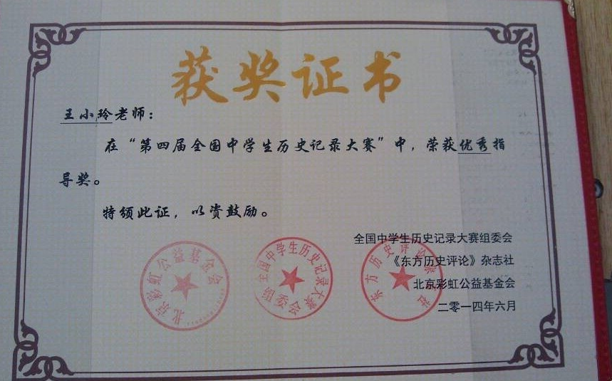 我校学生在全国中学生历史记录大赛中获奖 王小玲获指导教师奖
