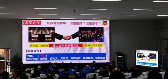 会议第二项有我校政治组胡燕老师献课。她讲课的题目是《做自信中国人,圆盛世中国梦》。胡老师设计该堂课时是基于“教学评一致性”的需要和我校健全人格和学科核心素养的需要、学科综合实践活动课课题的需要设计的。这堂课有三大篇章。