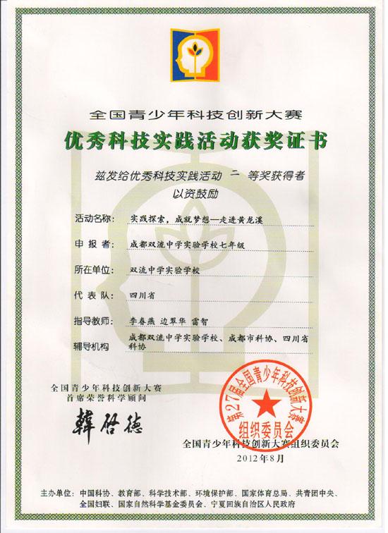 我校学生小组研究性学习课题、优秀科技实践活动《实践探索,成就梦想——走进黄龙溪》荣获全国二等奖、省一等奖。