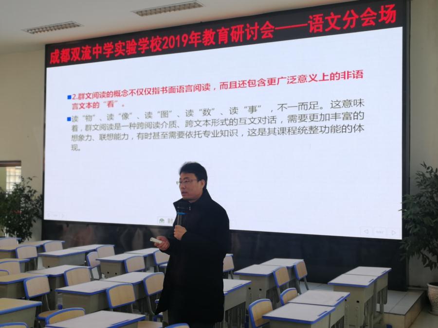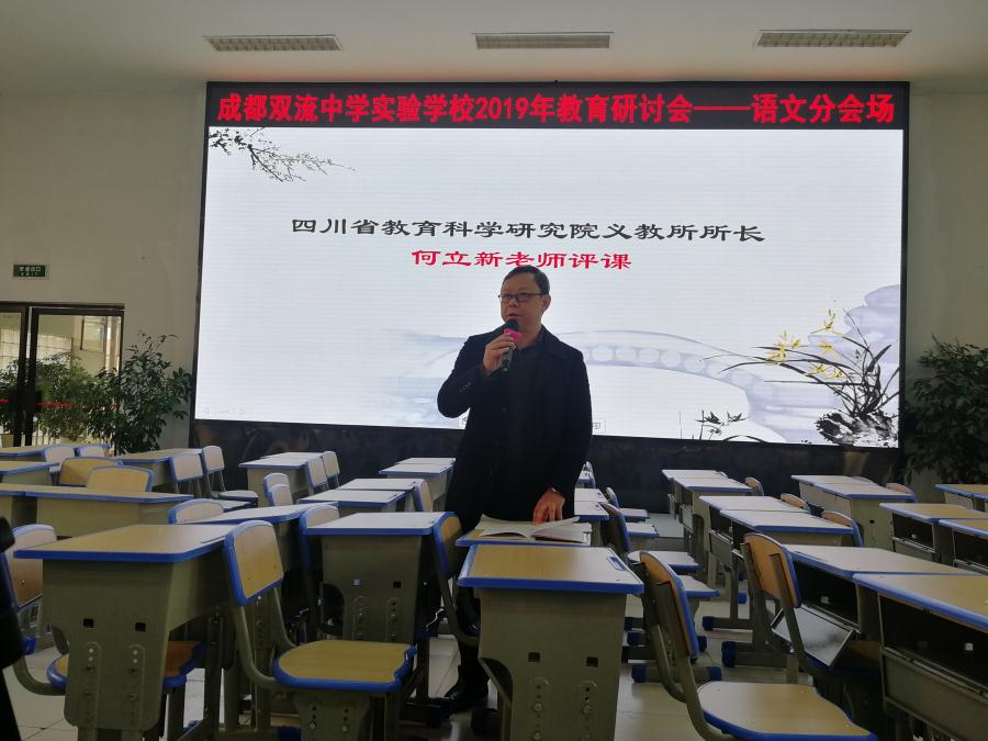 莅临本次语文分会场研讨活动的嘉宾有四川省教育科学研究院义教所所长何立新,山东师范大学文学院教授博士生导师潘庆玉,语文报社阅读与写作示范校项目部负责人张顶峰,语文报社发行部大区经理孙凯,语文报社四川办事处李泓泉、张亚飞,成都市双流区语文教研员李艾璘。学校校长高志文、校长助理罗晓章、行政办公室主任刘尧树、办公室副主任孙久木,学校中小学语文教师和部分家长代表到场参会。会议由青年语文教师张柔主持。