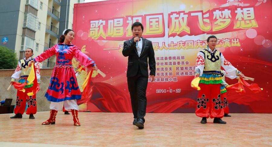 9月27日,我校夏栋梁、刘奕、何铁三位老师参加了由县统战部牵头举办的“放飞梦想-歌唱祖国”庆祝新中国成立65周年文艺汇演活动,三位老师分别以高亢的歌喉、优美的舞姿、精湛的魔术表演向观众呈现了才艺,展示了我校教师的风采。(夏栋梁)