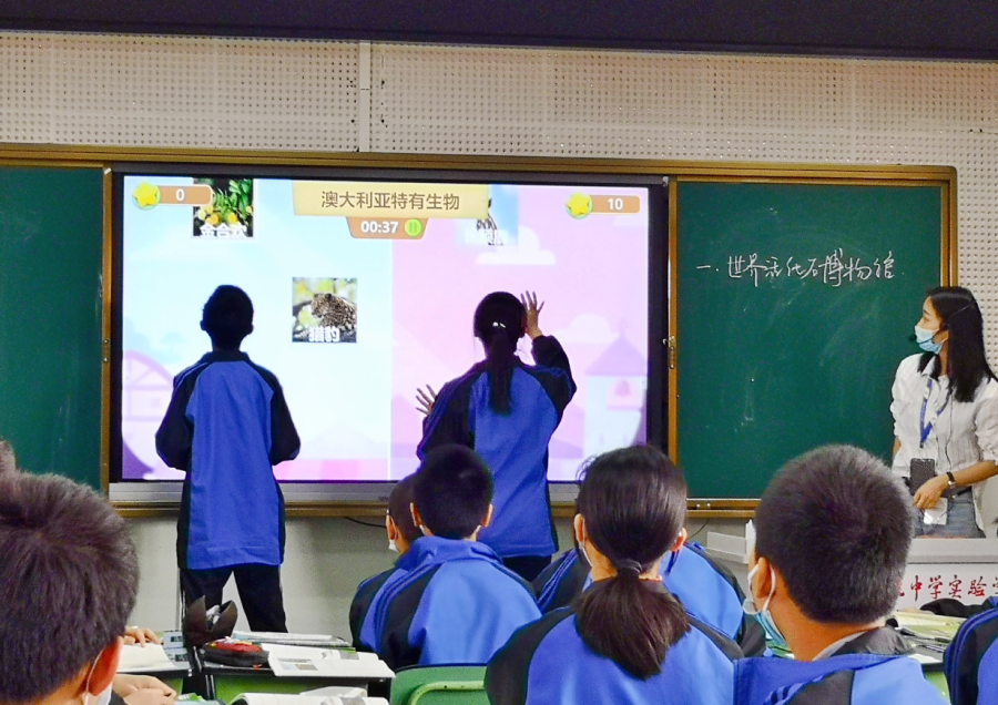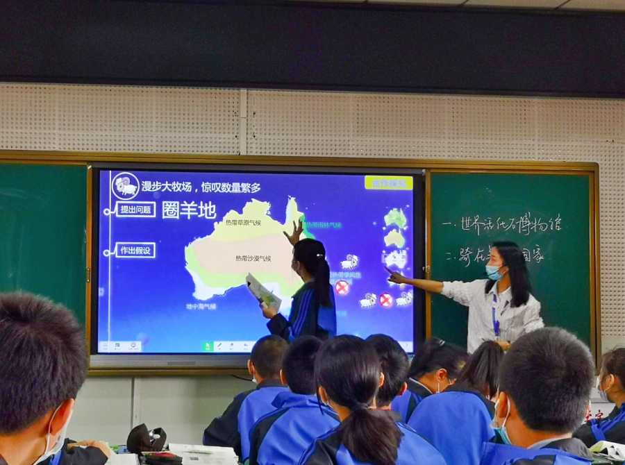 整堂课分成三个环节,“行走博物馆”环节中,以自主学习方式认识澳大利亚的生物及其特点,通过资料了解澳大利亚生物古老性的成因,学生达成知识自然,通过游戏检测知识习得是高效的;“漫步大牧场”环节则采用小组合作探究方式,小组讨论澳大利亚适宜养羊和不适宜养羊的地点,充分运用多媒体技术克隆方式圈羊地,将小组讨论的结果高效又明确呈现给其他小组,引发小组之间的探讨,充分发挥了学生自主性,验证猜想环节则利用蒙层技术引得学生一阵欢呼,最后澳大利亚牧羊带的布局帮助学生归纳发展养羊业的区位因素。“知识迁移”环节时转身来到了身边的地理单元——四川,实现了知识迁移和方法的提升。