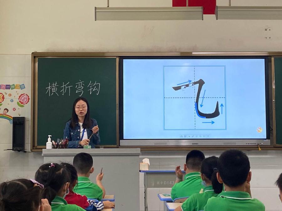 第二节课是吕品仪老师的书法课《横折弯钩》。吕老师用一年级学生贴切的语言“兰亭小精灵”带领学生进入课堂,利用实例找成语中的笔画,更加让学生深刻的记住笔画的写法,同时也学习到了成语知识。运用对比的方法,让学生更加记忆深刻的区分形状相近的笔画。