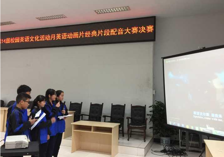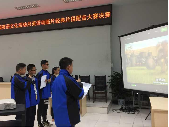 12月7日下午5:00,第14届“校园英语活动月”7年级经典英语动画片配音比赛在学校学术演讲厅举行。本次比赛,由学生自主选取3分钟的动画片段进行英语配音,《功夫熊猫》、《海绵宝宝》、《疯狂原始人》、《疯狂动物城》、《马达加斯加》、《豚鼠特工》等经典动画片经参赛队员配音演绎,七年级的同学在语言能力上的训练还不多,但也有不少同学表现得惟妙惟肖。期待他们明年更精彩的表现。