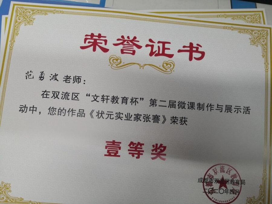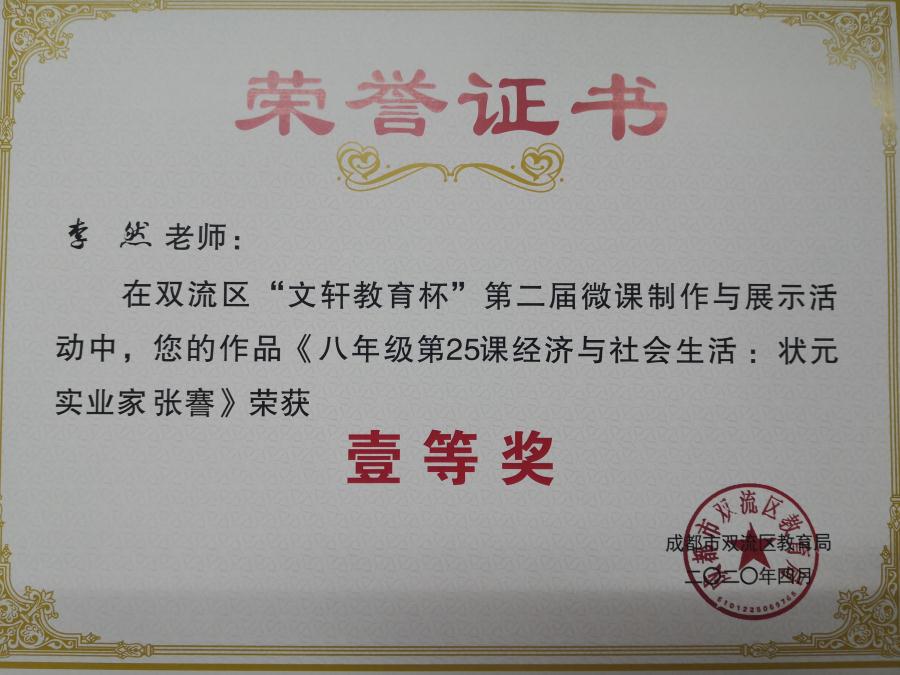 近期,从成都市教科院和双流区教育研究院和教师培训中心传来喜讯,我校历史组多名教师在论文评选、微课制作、优课评选中获得市、区一等奖。其中,李然老师一人拿下五个“第一”。她的视频课例《古韵黄龙溪 探寻龙文化》、《经济和社会生活的变化》获成都市“一师一优课、一课一名师”暨“课堂大比武”一等奖;她的优课在双流区2019年秋季课堂教学大比武优课评选活动中获一等奖;在双流区“文轩教育杯”第二届微课与展示活动中,李然老师的微课作品《经济与社会生活:状元实业家 张謇》与历史组教师范勇波的作品《张謇》、胡敏霞的作品《东晋的建立与南朝的政治》一并获得双流区一等奖。
