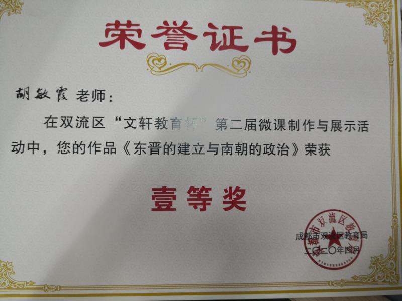 另外,历史组张玉萍、何玲老师撰写的论文《浅论研学旅行中的家国情怀培养—以“黄龙溪与龙文化内涵探究”研学旅行为例》在成都市2020年中学历史优秀论文评比中获一等奖。