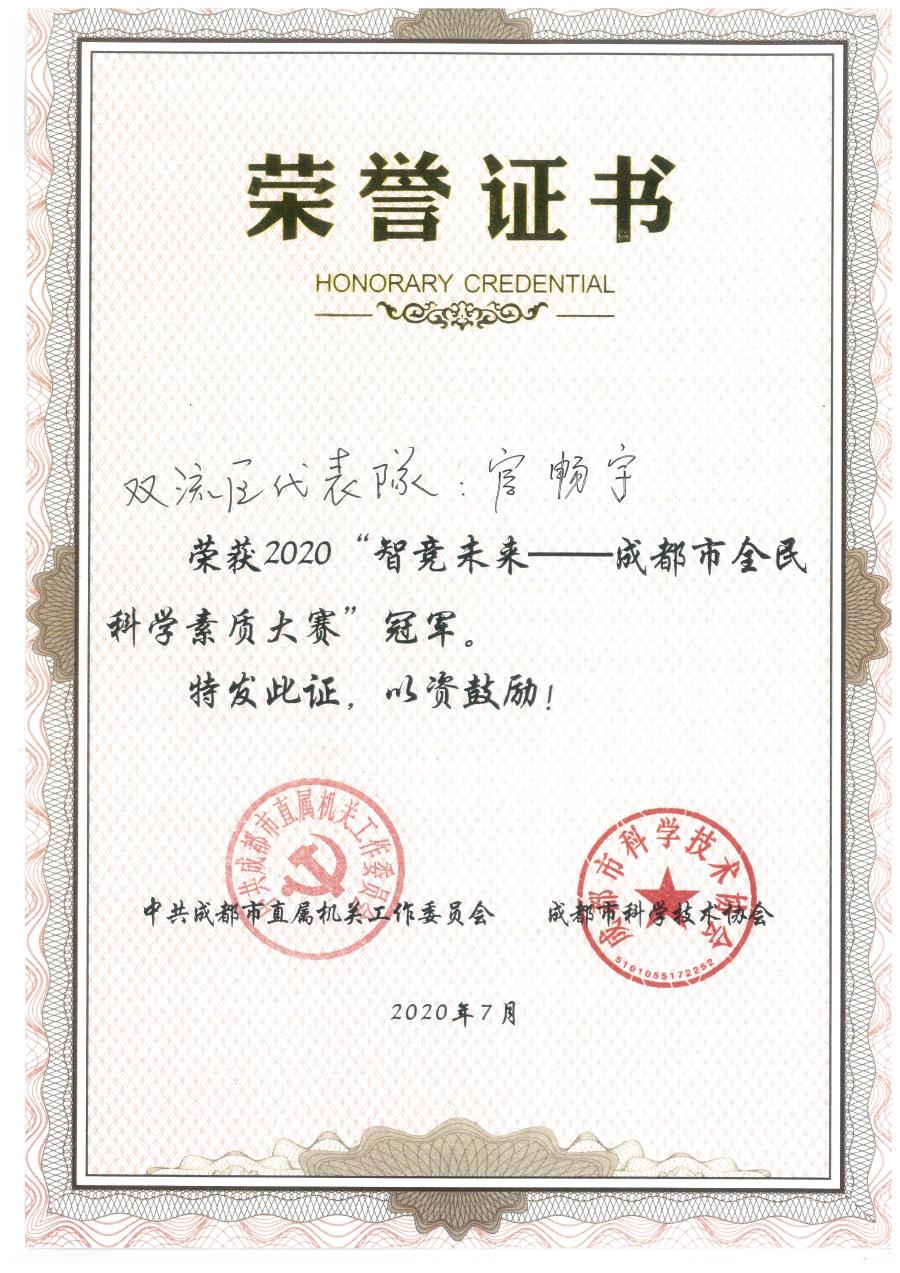 在带领双流区代表队获本次成都市全民科学素质比赛冠军后,双流区科协负责人陈斌秘书长给学校通报指出:在这个成都市最权威的电视大赛中,官畅宇作为唯一的学生代表,成为决赛赛场最耀眼的明星。现场的人员都在问这个学生是哪个学校的,怎么会如此优秀!赛后成都电视台还对官畅宇同学进行了专访。