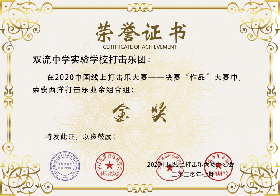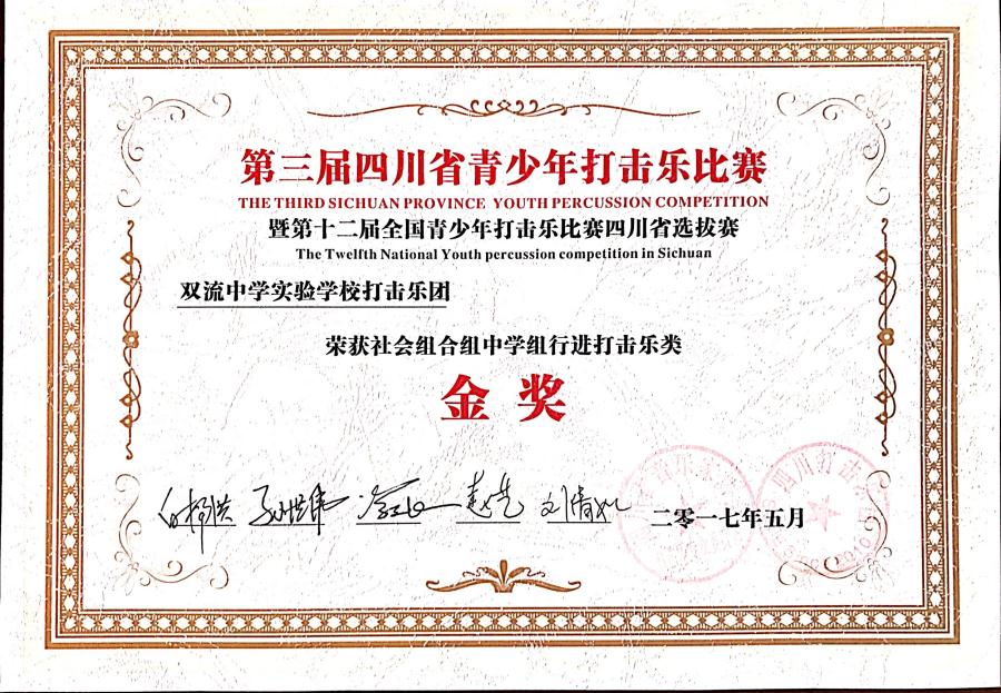 学校打击乐团代表学校参加多个赛事活动获得大奖:2017年5月,星空在线登录官网打击乐团获得四川省第三届青少年打击乐比赛中学组行进打击乐类金奖;乐团核心成员鞠蕴哲获得行进小军鼓独奏比赛一等奖。2018年5月,双中实验校打击乐团参加双流区中小学生艺术节器乐合奏比赛,获得小合奏一等奖。(艺术组 吴玲)