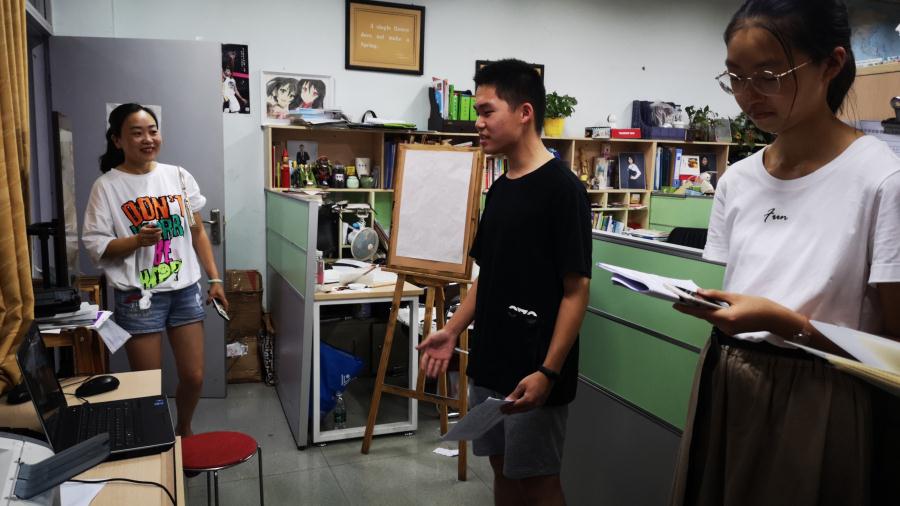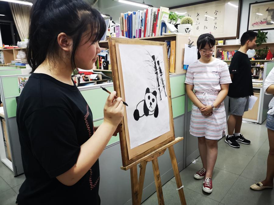 小老师们声情并茂地教着美国学生如何用毛笔画熊猫,一边教还一边提醒使用毛笔的注意事项。有了之前的介绍与铺垫,美国学生们在小老师的引领下很快就画出了神态各异的大熊猫。小老师们对学生们的作品一一作出点评,并对画好中国水墨画给出了自己的建议。
