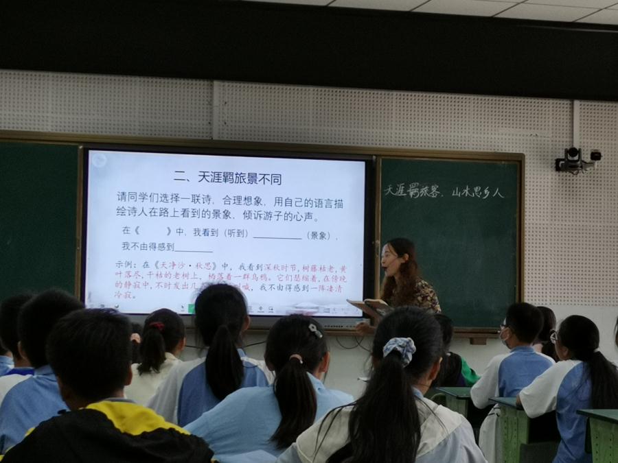 紧接着,何梦婕老师为大家献了一堂名为《天涯羁旅客,山水思乡人》的群诗阅读教学课。何老师这堂课始于朗读,学生在老师的指导下,学会了古诗朗读“气断声连”的方法,学生的朗读语速慢下来后,朗读的效果一下就出来啦!何老师这堂课的教学设计和王老师的课有着异曲同工之妙。第一个环节“诵读诗歌拟主题”,何老师引导学生找出三首诗歌的共同点——羁旅诗;第二个环节“天涯羁旅景不同”,学生抓住意象,描绘画面,感受三首诗歌不同的意境;第三个环节“万里思归游子心”,何老师补充诗歌的创作背景,引导学生比读三首诗歌不同浓度的羁旅愁情,得出“每一位诗人都是一个时代的缩影”这一结论。最后,何老师和学生一起总结出学习羁旅诗的方法。