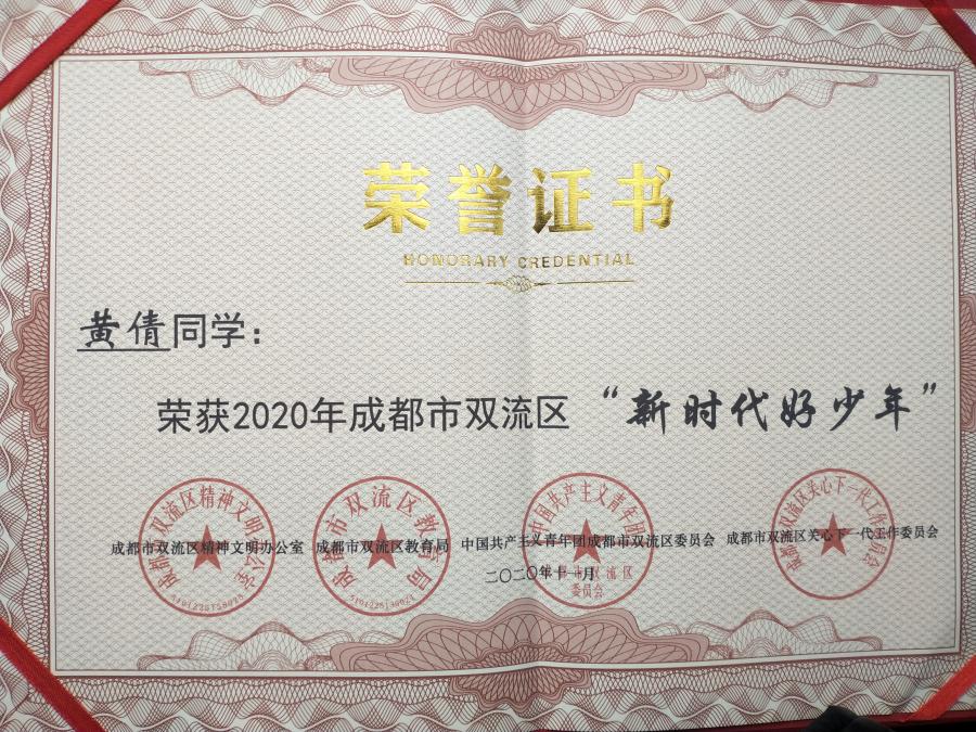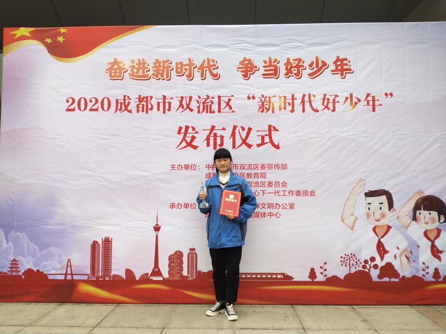 11月29日上午,由成都市双流区文明办、区教育局和区团委举办的“2020双流区新时代好少年主题宣讲暨颁奖仪式”在双流区志愿者服务中心召开。我校2022届2班的黄倩同学以“投身公益,乐于助人”,当选为“双流区2020年新时代好少年”,并受到表彰。