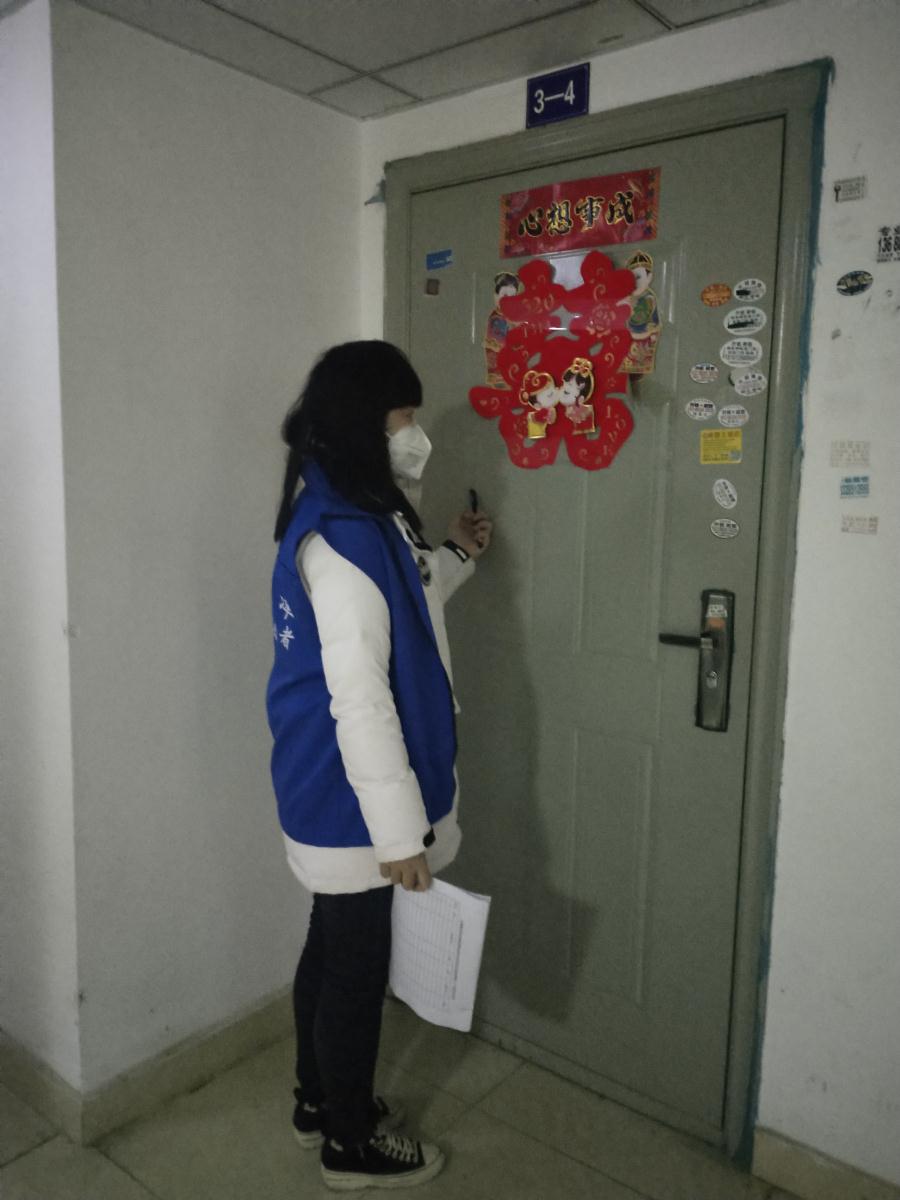 一家又一家,黄倩同学已熟悉了工作,她的速度也变得越来越快,但……“咚咚咚”,又敲开了一扇门,满怀信心的她刚说出此次来的目的门便“彭”的一声被关上,心里也随着这门的的声音一震,迎来了的是失落与悲伤。社区人员都已习以为常,面对别人的拒绝只能不断解释,希望他们能够理解和配合。
