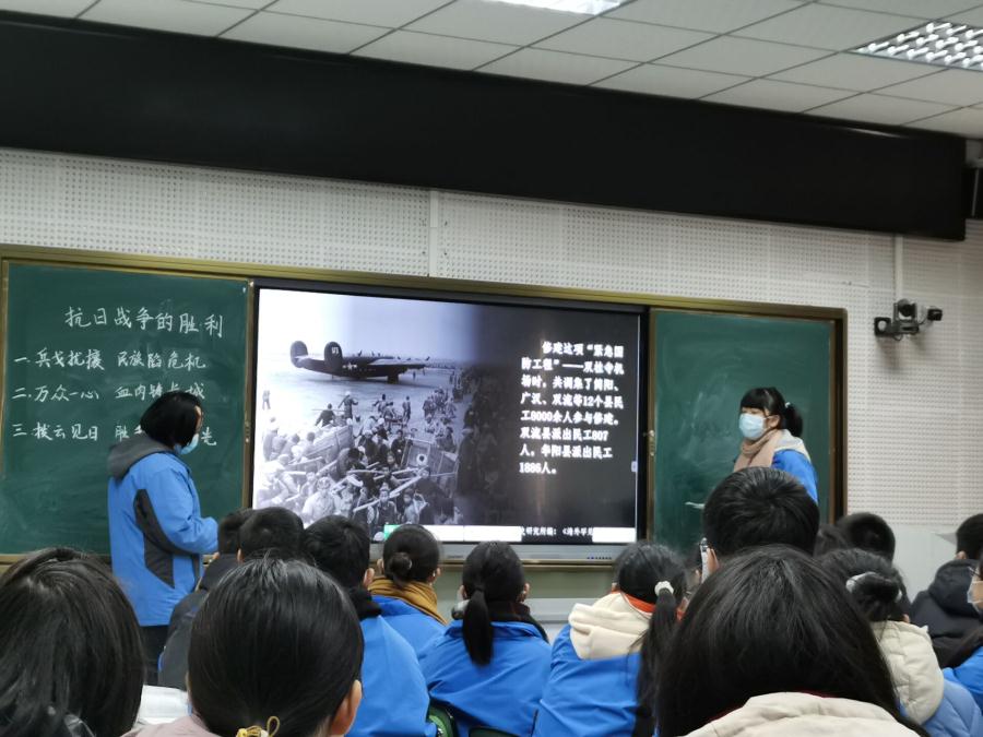 历史组全体教师对本课课标和学科核心素养进行深入的探讨,充分研究了学校“健全人格”课题研究理念,制定了本课的教学目标——广泛引用抗战后期的第一手资料,以贴近八年级学生最近发展区的问题引领学生的思考、讨论,进而得出结论,初步培养学生史料实证素养;以张自忠和左权的书信为切入点,通过学生深情朗诵,感知抗战名将的儿女情长和“舍小家顾大家”的民族大义,在点滴的历史细节中浸润家国情怀,提升本课的教学立意;开展学科问题课题化研究,以“探究双流人民在抗战中的贡献”为主题,带领学生走进双流区档案馆,收集第一手资料,学生在“自主、合作”中探究相关问题、分析数据、得出结论。