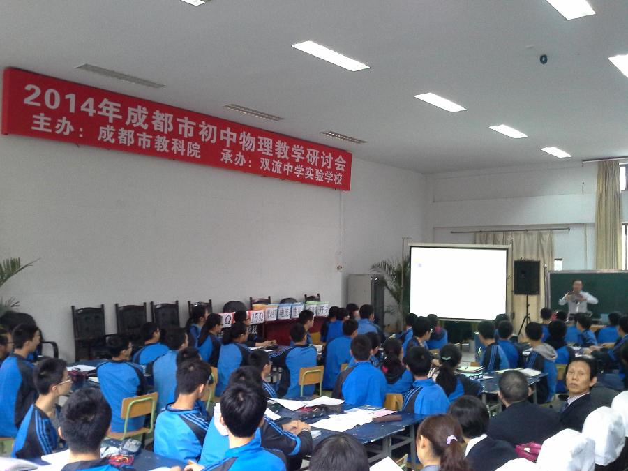 10月30日,2014年成都市初中物理教学研讨会在我校举行。会上,我校物理组詹先斌老师为来自全成都市的专家和老师献出了一堂精彩的展示课《串联电路的等效电阻》。詹老师充分利用我校主研的市级课题《自主合作探究式课堂教学模式构建研究》的研究成果“初中物理概念课自主合作探究式教学模式”进行课堂教学设计,从创设情境激发兴趣、诱发思维分析问题、实验探究师生共鸣、归纳总结达成共识等几个环节开展教学。首先,詹老师展示了两个黑箱子,里面装着电阻。接入电路发现,电路中的电流相等,于是学生们认为箱子里装的是相同的电阻。打开一看,学生们大吃一惊,里面的电路完全不同。从而引出了等效电阻的概念。接着,围绕串联电路的等效电阻,詹老师引导学生开展了丰富的探究活动。整个教学过程环环相扣、层层推进,以学生为主体,让学生充分参与整个教学过程,有效体验整个学习过程,较好的体现了自主、合作、探究的理念,为全体与会老师和专家充分展示了我校教师在课模研究方面的成果。展示课介绍后,我校科创班垃圾处理研究小组还为全体与会老师和专家汇报了他们在《双流县垃圾处理现状》获得的成果,赢得专家和老师们的高度评价。(物理组 罗川)