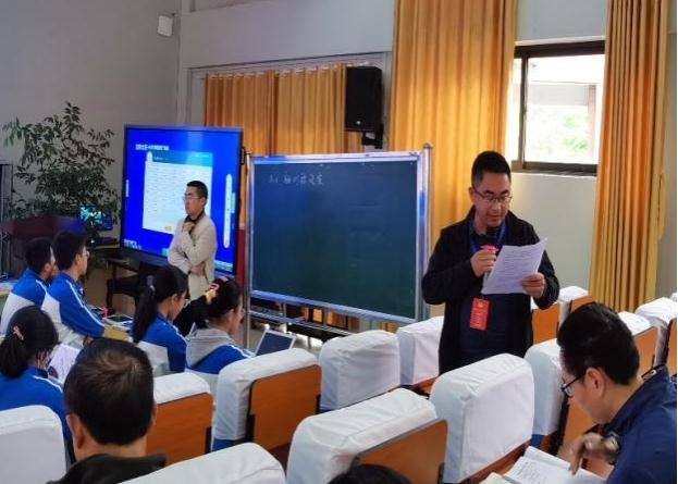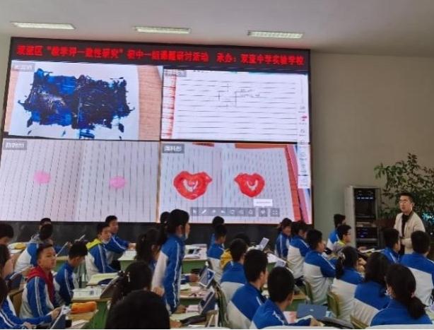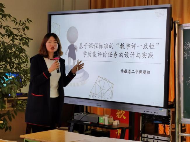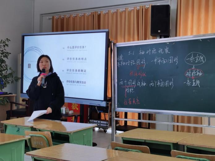 万静老师对本堂课进行说课,万静老师就课标要求、教材分析、健全人格的渗透和核心素养的培养、学习目标、评价任务、教学过程等进行了说明。之后四所学校老师们代表也对于“教学评一致性”的评价任务的设计与实践研究作了专题发言。黄艳老师对万静老师这堂课进行了点评和说明,展示了我校的“评价任务”设计,肯定了万老师本堂课的设计,整堂课万老师和同学们都以平板进行教学,教学过程中多功能的运用,能及时高效反馈评价任务的达成情况,帮助老师更好的调整教学。