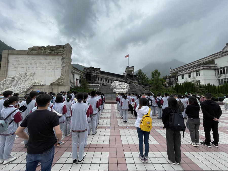 生命,说有多脆弱就有多脆弱;生命,说有多坚强就有多坚强。地震让我们知道,困难也许不会离去,但坚强会陪我们前行。地震,震不碎中华民族的团结之心!师生齐默哀,共献花圈,感悟感受生命意义。
