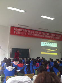 我校吕惠兰老师于2013年11月27日在成都市教育科研规划课题《自主合作探究式课堂教学模式构建研究》现场结题暨“国培计划(2013)”四川省中小学教育科研人员培训者培训活动中星空在线登录官网学术厅上了一节《写景要有情》的精彩的写作示范课。课堂上吕老师的精妙引导,学生的精彩表现给听课的专家、老师们留下了深刻的印象。课后乐山市一位研究员感慨地说:“作文课也可以这样的精彩呀!这是我听过的最好的写作指导课,是当今作文教学方面难得的高质课”。吕惠兰老师在初中语文作文教学中良好的辐射作用,充分体现了我校在重视教师专业化发展中取得的成果,也反映我校教师在特色班教学路上努力探索取得的成绩。