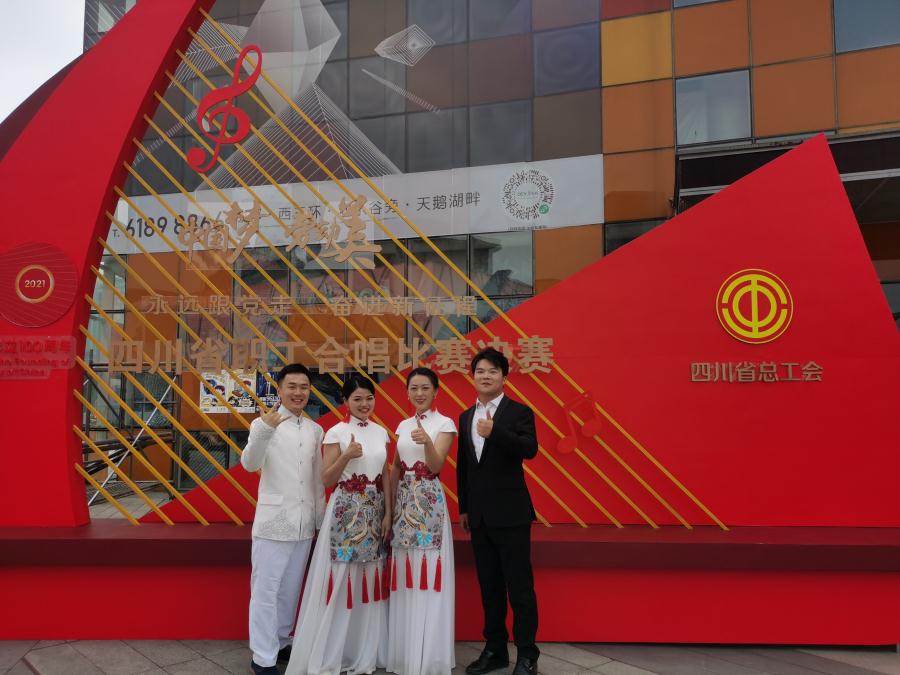 “中国梦·劳动美——永远跟党走 奋进新征程”四川省职工合唱比赛是全省“永远跟党走”群众性主题宣传教育活动之一,是全省职工庆祝庆祝中国共产党成立100周年的重要活动。据了解,四川省职工合唱比赛于今年3月正式启动,分为选拔赛、片区赛和决赛三个阶段。经过激烈角逐,最终12个市(州)总工会,省产业(局)、企业集团(公司)工会选送的,来自电力、交通运输、建设建筑、能源、生态环境、媒体、机关事业单位、保安、房屋中介等行业的13支队伍、971名职工进入了决赛。本次决赛现场评出金奖2名、银奖4名、铜奖7名,优秀组织奖15名。我校夏栋梁、吴玲、张静、李意四名教师受邀参加区级组队,其中夏栋梁老师为合唱团指挥,吴玲、张静老师担任参赛作品领唱,在比赛中我校教师扮演了重要的角色,出色的完成了合唱团各项任务,促成了初赛、复赛、半决赛、决赛中的出色发挥,再次向社会展现了名校名师风采!( 图文来自:夏栋梁)