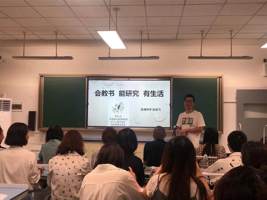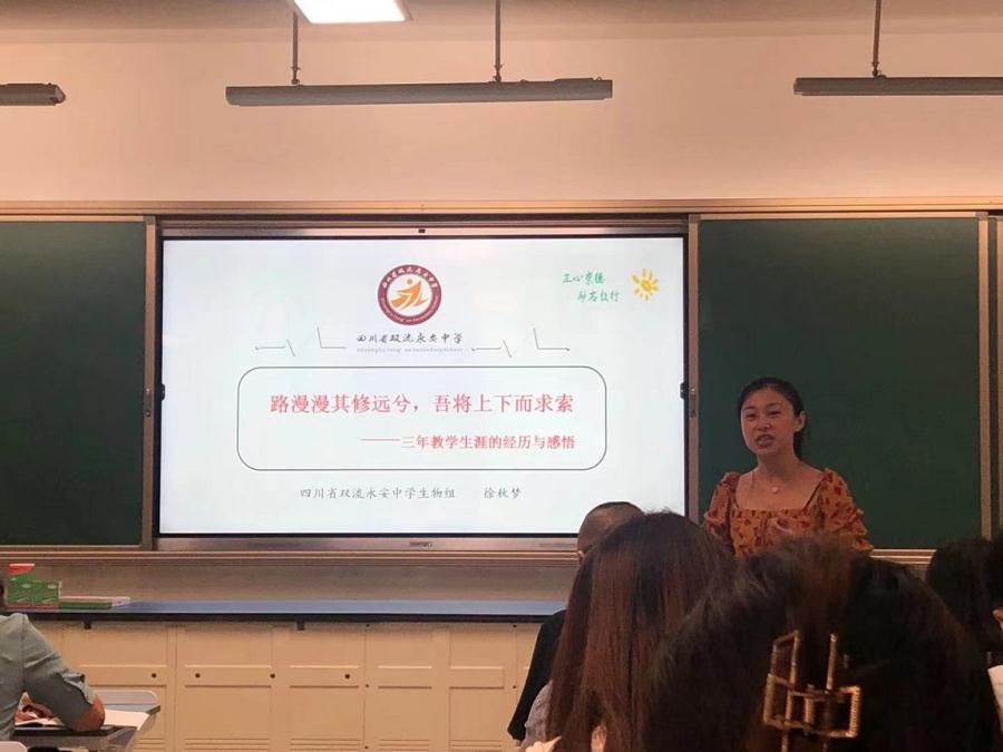 第一环节由四川省双流永安中学徐秋梦做主题发言,发言主题为:路漫漫其修远兮,吾将上下而求索——三年教学生涯经历与感悟。徐老师分别从初生牛犊 临危受命、胆战心惊 克服困难、再次历练 从容不迫、随时学习 探索世界、道阻且长 行则将至五个部分做了分享,赢得了与会老师的一致好评。第二环节由棠湖中学张成飞老师做题为:会教书、能研究、有生活的经验分享。