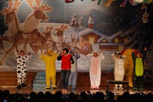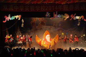2013年12月20日晚,一年一度的迎春英语圣诞晚会在我校多功能厅如期举行。全英文节目带来的英语风潮点燃全场的气氛,让下着绵绵细雨的冬夜变得格外温暖,全校师生沉浸在圣诞的欢乐和新年的喜悦中。 同学们的精彩节目接连不断,有英语歌曲独唱串烧、英语诗朗诵、英语短剧、舞蹈表演等等,好戏连台,惊喜不断。同学们身怀绝技,各显神通,不论是唱歌还是跳舞,合唱还是独唱,戏剧还是朗诵,均是精彩纷呈,技艺精湛。学生改编的童话故事的带领学生重拾童年的记忆,中国传统成语故事如《郑人买履》经同学们创意十足的修改后以现代身份再上舞台。一些经典的电影被改编成为英语剧,如备受学生喜欢的《大话西游》。晚会上,圣诞老人多次出现发放礼物,high翻全场,把整台晚会气氛推向高潮。最后由外教和2016届全体英语教师的大合唱及健美操表演为晚会完满拉下帷幕。(英语组 杨四维)