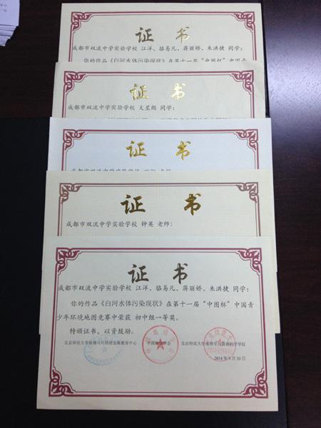 活动期间,我校领导莅临指导,为我们提供了宝贵的意见,地理组全体老师全程参与,2014年9月第十一届“中图杯”中国青少年环境地图竞赛在北京落幕,我校科创班学生文星朗作品《地理环境地图——双流艺术公园的生态环境》;江洋、骆易凡等同学作品《白河水体污染现状》喜获初中组一等奖,并且揽获初中组最佳调查奖。(丁翔)