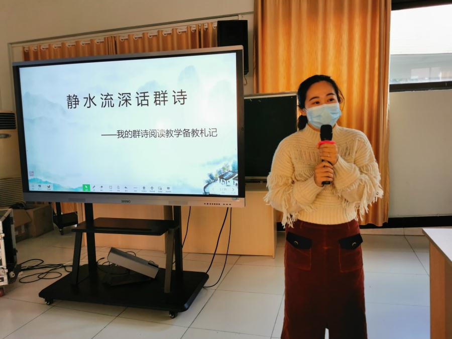 接下来,杨雪梅名师工作室成员何梦婕老师分享了她关于群诗教学研究的感悟。何老师总结了群诗教学的三大保障:议题引领、关联整合以及任务驱动。其中,她指出“议题引领”很关键。所谓议题应 该是可以讨论的话题或线索,它应该具有贯通性、关键性、议论性和开放性。只有理论上有清醒的认知,才能更科学地指导实践。