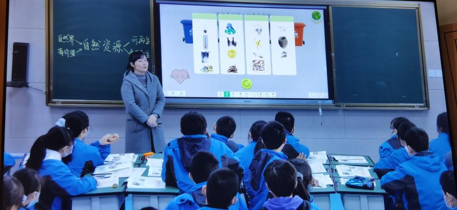 课堂刚开始,向老师带领学生领略了大自然的美景和声音,同学们身心愉悦的走进了本节课的主题——自然资源。本课分为三个环节,向老师分别以自主学习、合作探究和情感升华三步骤带领学生深入浅出认识中国自然资源的特征。整堂课环节紧凑,学生参与热情,课堂氛围轻松愉悦,最精彩的要数合作探究环节中学生阐述自我观点时的旁征博引,引来全班同学阵阵掌声。向老师以小见大,从生活实物所用自然资源入手,带领学生纵观中国自然资源现状,再从理论到实际,培养学生保护地球就是保护自然资源,保护自然资源从我做起,从垃圾分类做起的意识,学生通过视频和亲身参与垃圾分类的小活动,充分领悟到正确的资源观、环境观。课后,学生意犹未尽,纷纷述说着自身体验和感受。