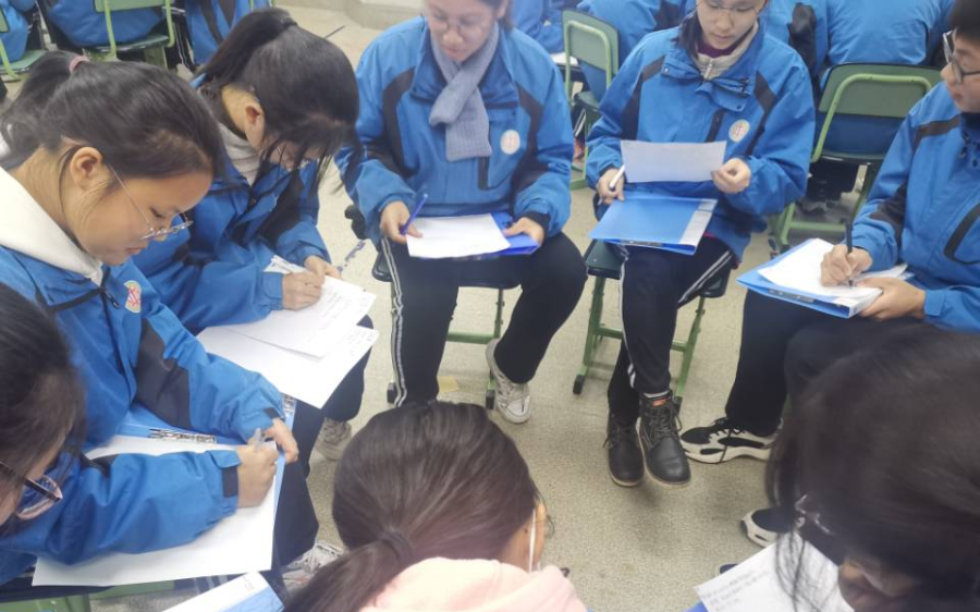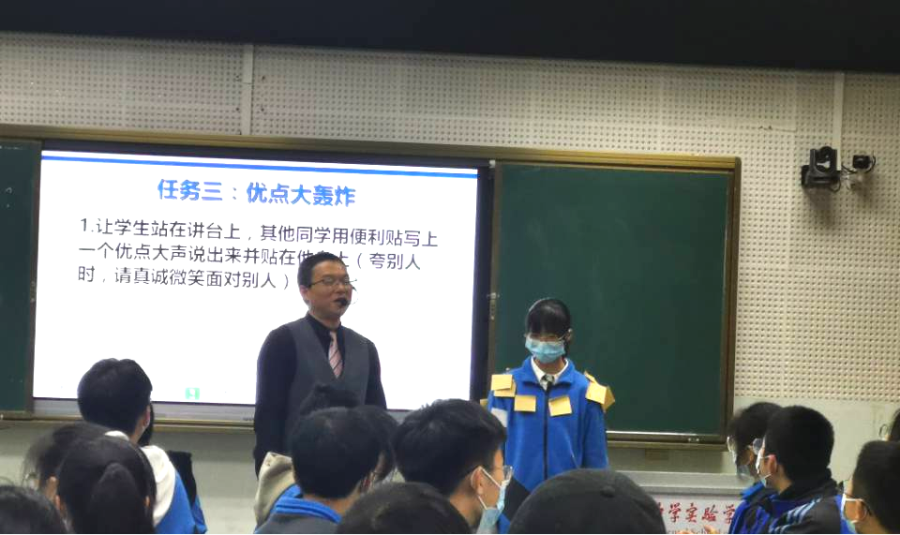 第14周周五,八年级谢娟老师主题班会课献课《你、我、他》。谢老师从两周前的语文能力竞赛的作文题为切入点。引入“认识你自己”这一话题,然后组织小组游戏“自我夸夸,我挺好”。先让学生把自己的优点尽可能多的写在纸上,然后再把这个纸,传给同学,以“我欣赏你——”的格式,同学互赞。如此一圈后,直到纸张最后再传到学生自己的手中。教师利用这张单子上的学生自评和互评结果,引导学生认识:1.正确看待差异;2.不能孤芳自赏、得意忘形、自以为是;3.有勇气正视自己的绊脚石,努力克服它。