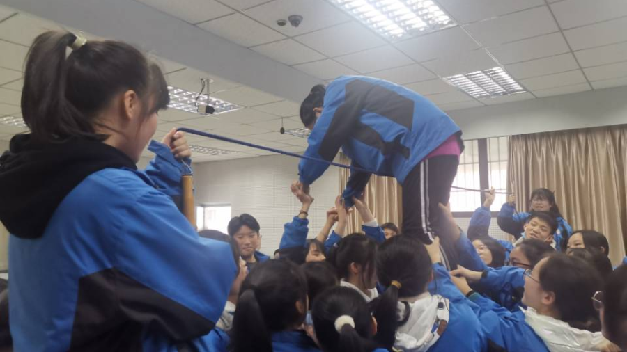 接着,谢老师组织情景游戏——“翻越火线”,即不借助任何工具,不能触碰绳子,10分钟以内,全班一起想办法。在游戏结束,谢老师让学生分享游戏感受,引导学生认识到美好的友谊,从接纳不完美开始,包容和善意可以成为他人莫大的动力。我们也许改变不了别人,但或许可以尝试改变我们对待别人的方式。如此,我们的人际关系,就会像一抹暖阳,给予你温暖,你、我和他,都能感受到生命的慰藉。